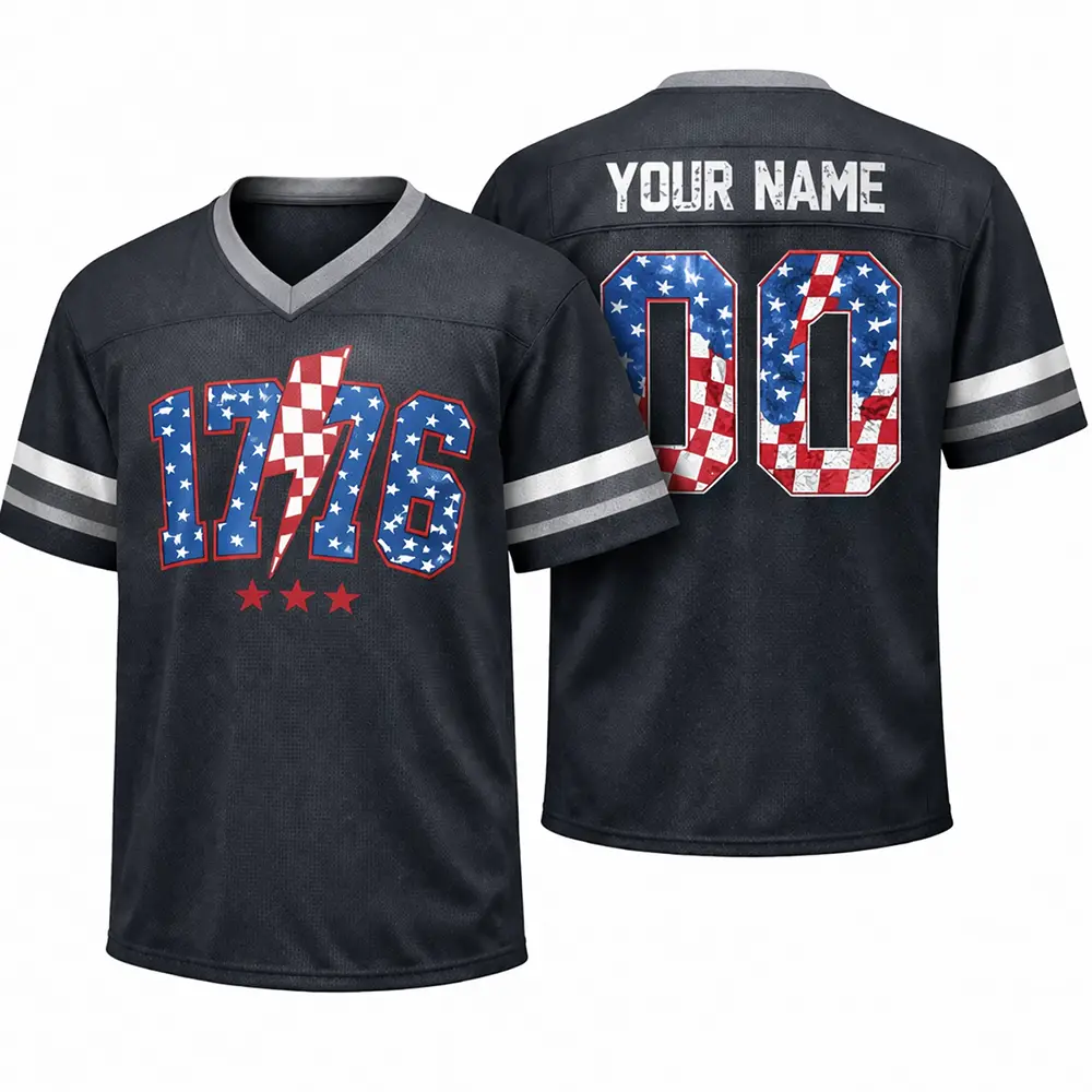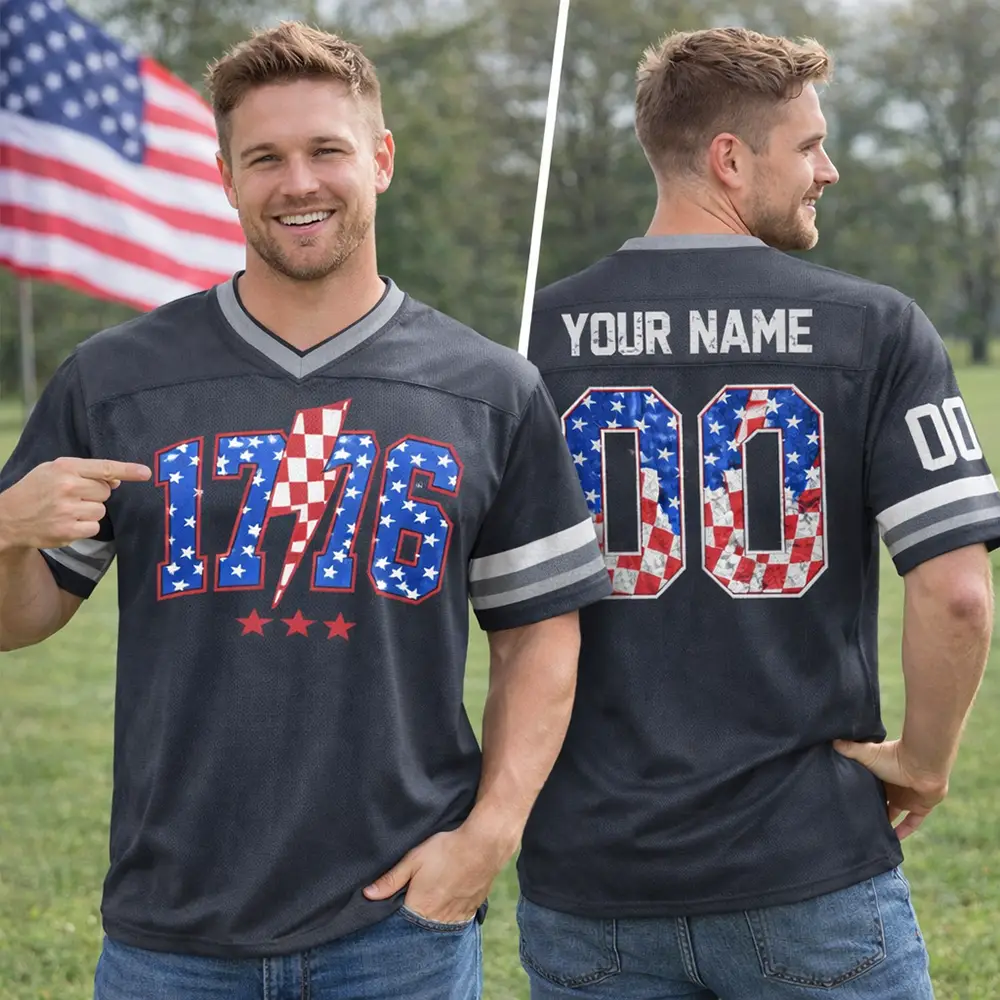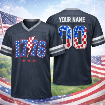 Show your love for the USA with the 4th of July 1776 Patriotic USA Red White Blue Football Jersey. Inspired by the spirit of freedom and the pride of Independence Day, this jersey combines patriotic colors with classic football style for a standout holiday look. It is perfect for 4th of July parties, family gatherings, and all your favorite summer events.