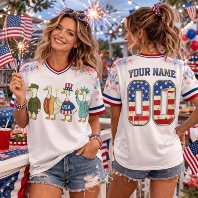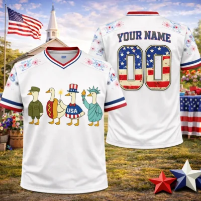 Humor and patriotic style come together perfectly in this 4th of July Goose Football Jersey Funny Duck American Patriotic Style. The funny duck-inspired design adds a cheerful twist to classic red, white, and blue fashion, while the football jersey silhouette keeps the look sporty and eye-catching. It is ideal for Independence Day celebrations, casual outings, and festive summer weekends.