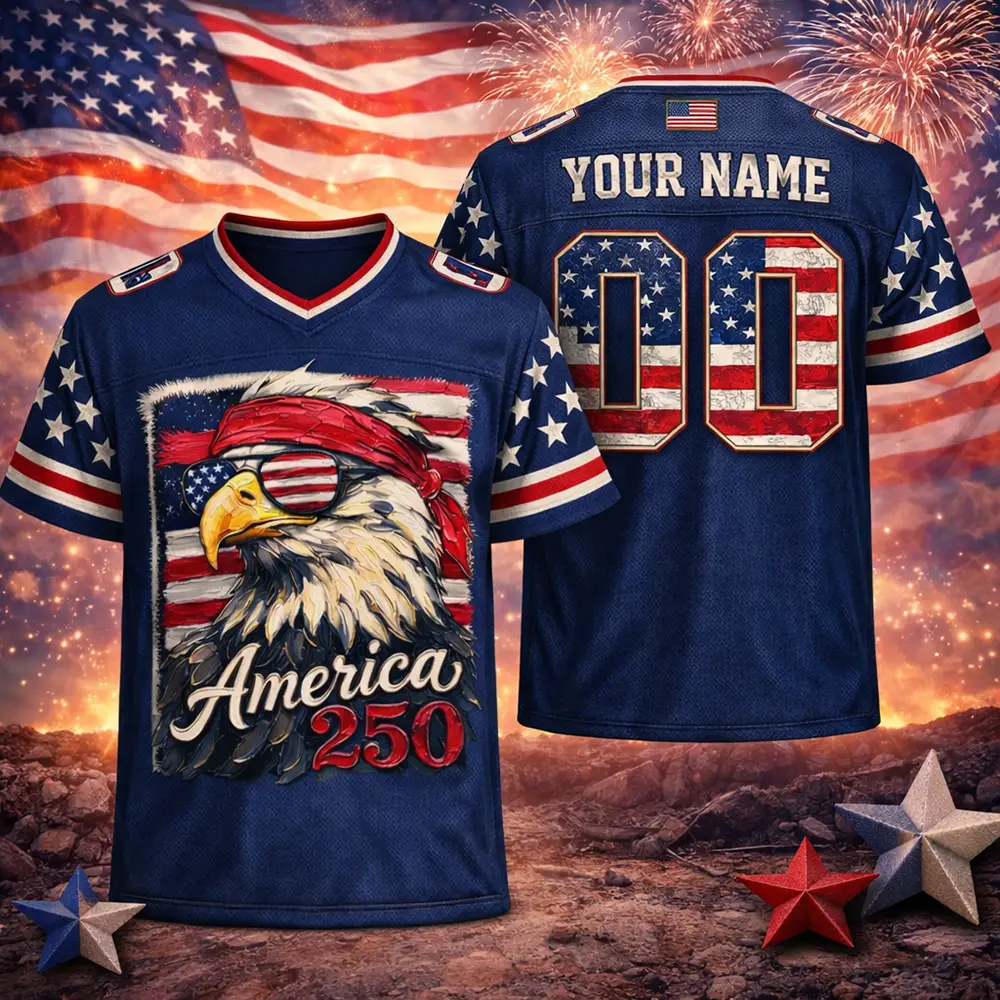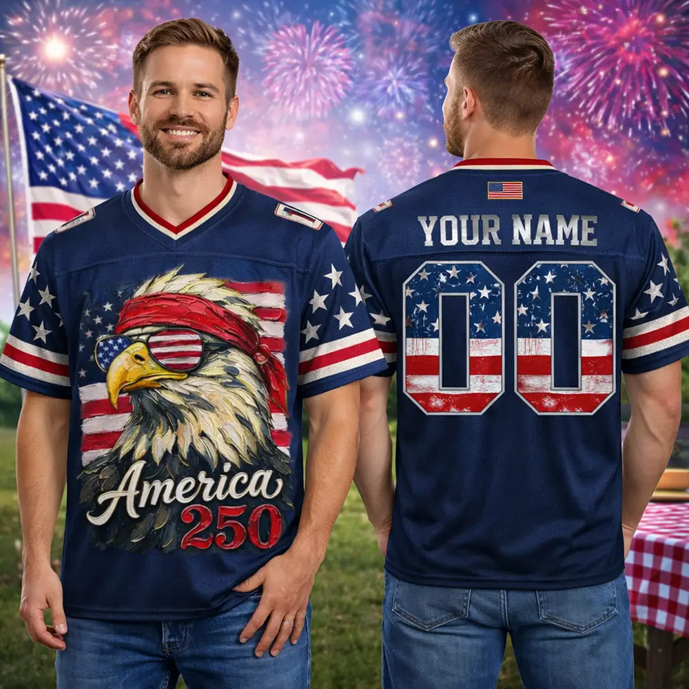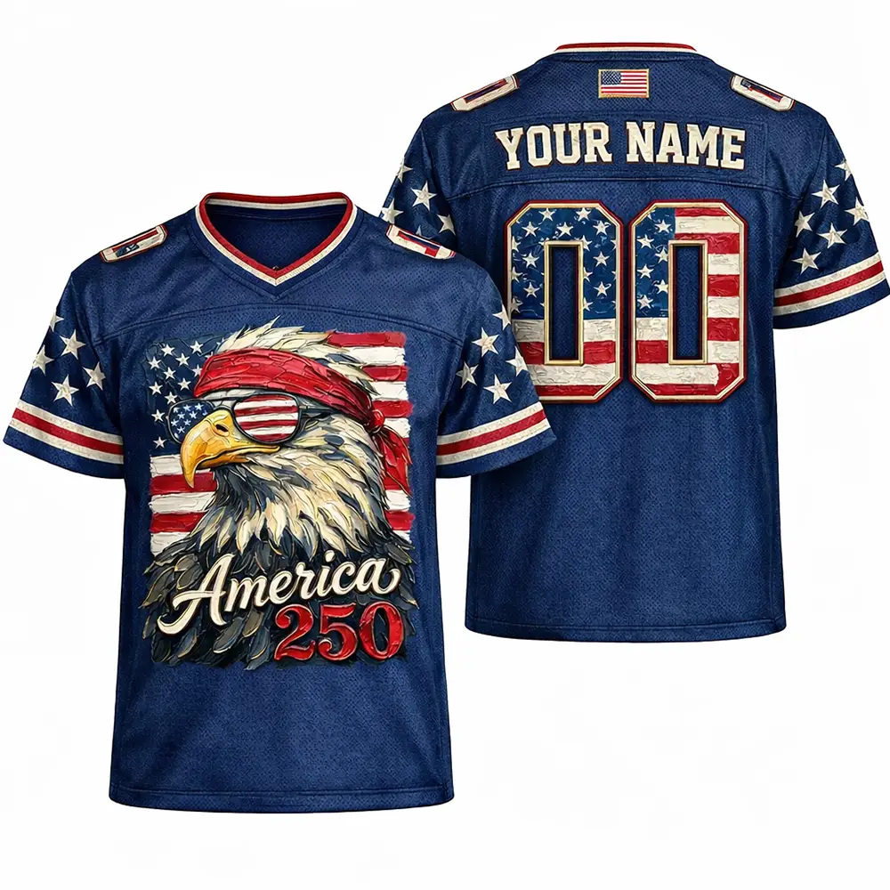 Classic American pride meets game day style in this America 250 Football Jersey USA 250th Anniversary Eagle Design. The eagle artwork adds a bold freedom-inspired detail, while the patriotic anniversary theme makes it perfect for celebrating the nation’s 250th year. Whether worn to holiday gatherings or given as a thoughtful patriotic gift, this jersey brings together comfort, heritage, and unmistakable American energy.