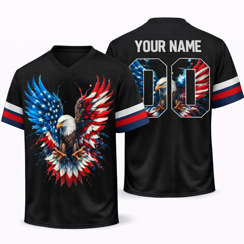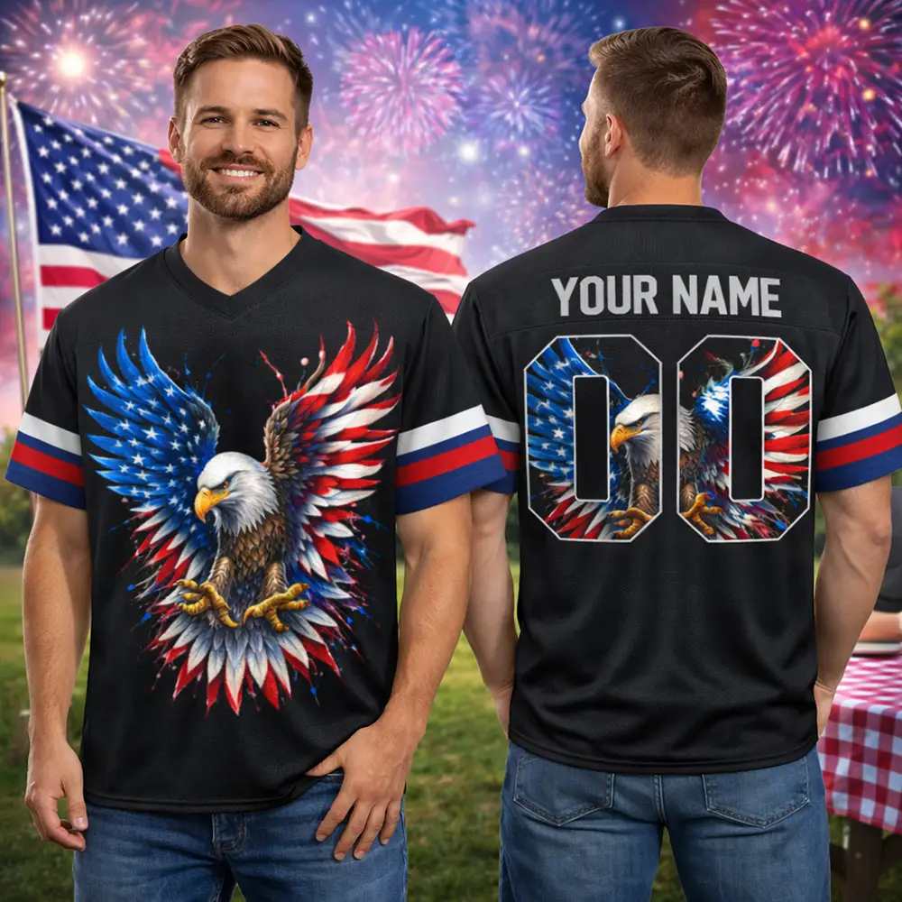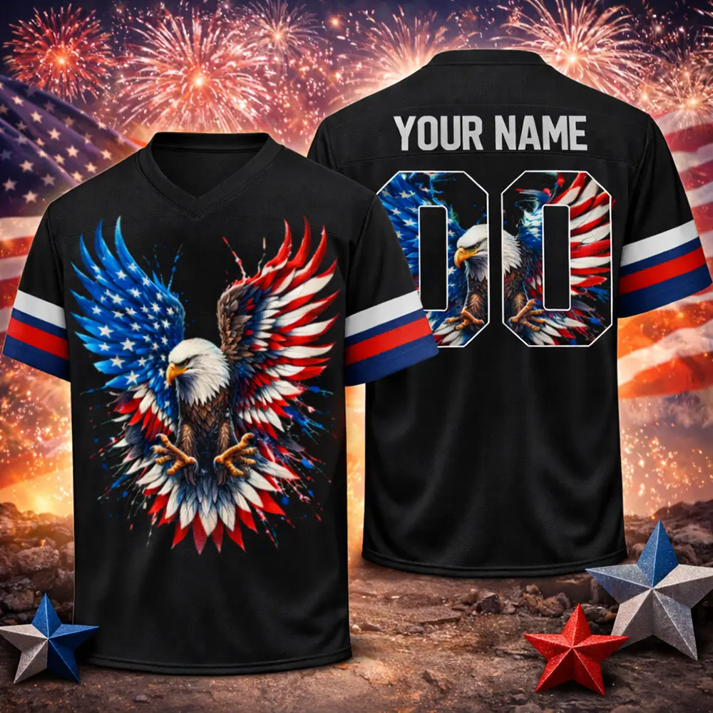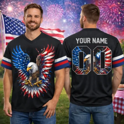 Show off your American pride in style with the Bald Eagle Football Jersey US Flag Patriotic 4th of July – a bold and eye-catching piece designed for true patriots. Featuring a powerful Bald Eagle graphic combined with the iconic American flag, this jersey represents strength, freedom, and national pride.
