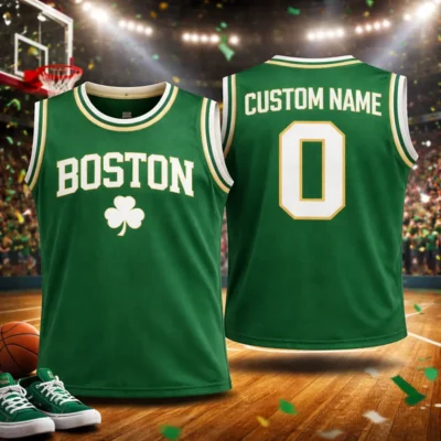 This custom Boston basketball jersey blends classic team-inspired style with personal detail. The front keeps the look bold and recognizable with Boston text and a shamrock accent, while the back gives you space to add your own name and number. The green colorway with white and gold trim delivers a fresh athletic look that works well for sports events, casual wear, or as a thoughtful personalized gift.