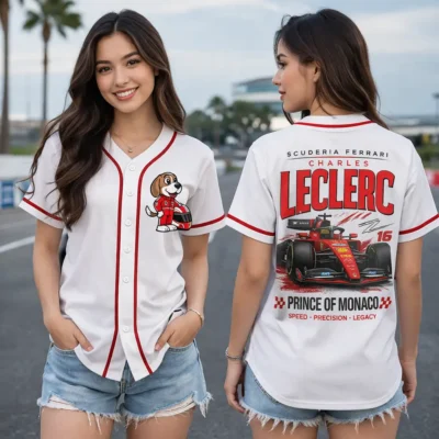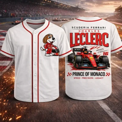 Bring a fun twist to your motorsport style with this Charles Leclerc inspired baseball jersey in white and red. The front features a playful cartoon dog graphic in racing gear, while the back delivers a bold fan look with Charles Leclerc lettering, a detailed Ferrari-style race car print, and “Prince of Monaco” inspired artwork. The clean white base with red trim keeps the jersey fresh, sporty, and easy to style with jeans, shorts, or sneakers. A great choice for race day outfits, casual wear, or as a unique gift for Charles Leclerc fans.