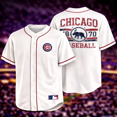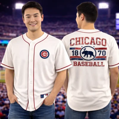 Add a bold vintage baseball look to your wardrobe with this Chicago Cubs jersey in white. The front features a clean Cubs logo for a simple team-inspired style. The back stands out with Chicago Baseball text, 1870 details, and a distressed bear graphic that give the jersey a strong retro feel. Easy to pair with jeans, shorts, or sneakers, this jersey is a great choice for casual wear, game day, or as a gift for Cubs fans.