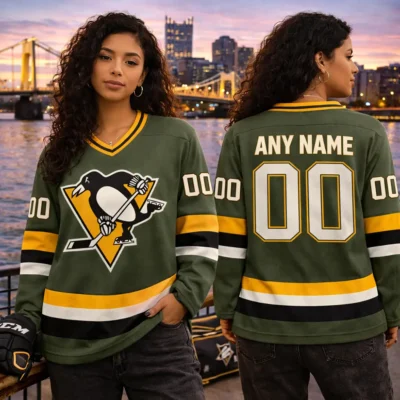This personalized Pittsburgh Penguins hockey jersey is a great choice for fans who appreciate vintage sports fashion. With its timeless design, strong team graphics, and custom back details, it is perfect for wearing to hockey games, sports events, or everyday outings. A unique gift idea for loyal Pittsburgh Penguins fans and retro NHL apparel lovers.