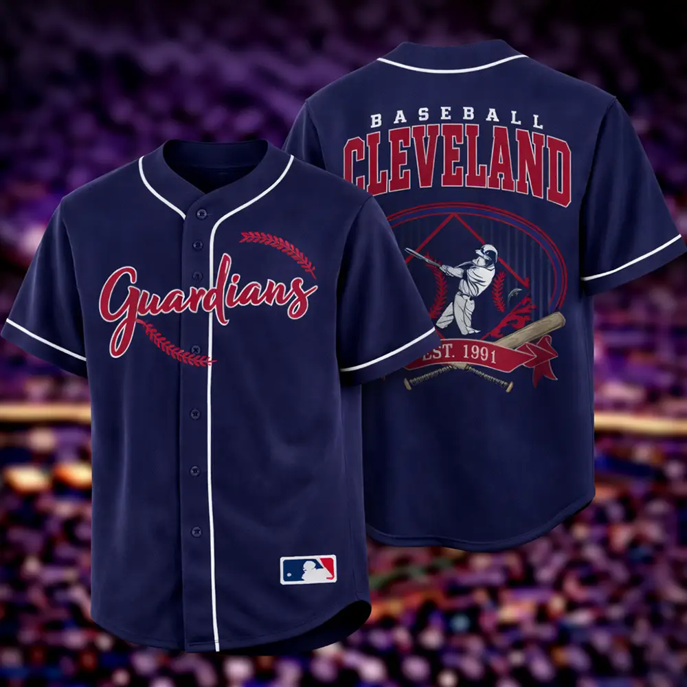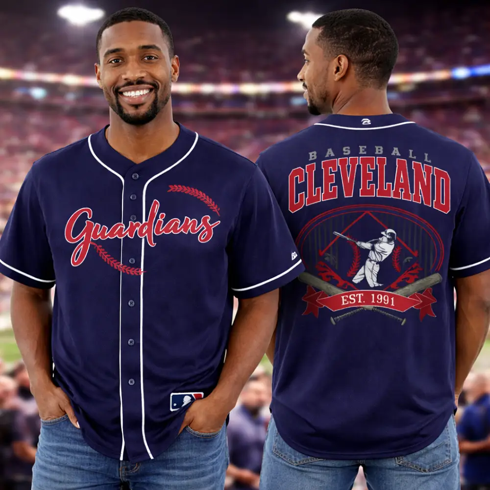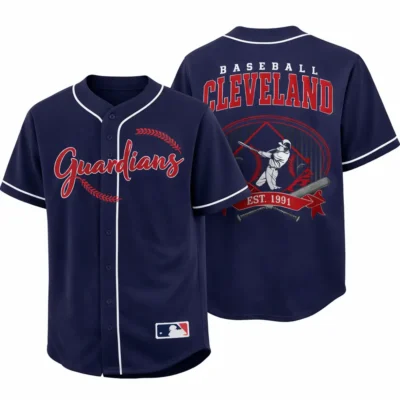 Give your game day look a bold upgrade with this Cleveland Guardians jersey in navy blue. The front features standout Guardians script with baseball stitch details for a strong team-inspired design. On the back, Baseball Cleveland text, a player swing graphic, crossed bats, and Est. 1991 artwork create a classic sporty finish with extra visual detail. The navy blue color adds a sharp and easy-to-style look, making this jersey a great option for casual outfits, baseball events, or a gift for Cleveland baseball fans.