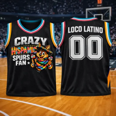 Bring fun personality to your fan wardrobe with this Crazy Hispanic Spurs Fan basketball jersey. The colorful front artwork gives it a lively and unique feel, while the black colorway keeps it easy to style for sports events, casual outfits, or group fan wear. A great pick for anyone who loves basketball and playful game day fashion.