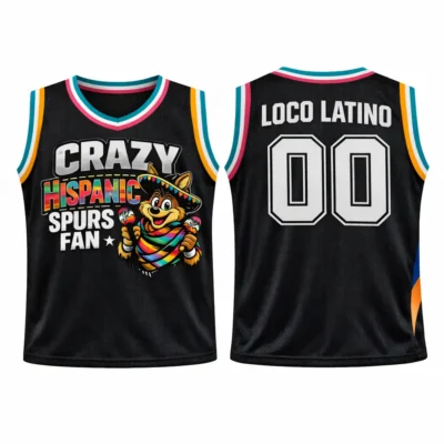 Bring fun personality to your fan wardrobe with this Crazy Hispanic Spurs Fan basketball jersey. The colorful front artwork gives it a lively and unique feel, while the black colorway keeps it easy to style for sports events, casual outfits, or group fan wear. A great pick for anyone who loves basketball and playful game day fashion.