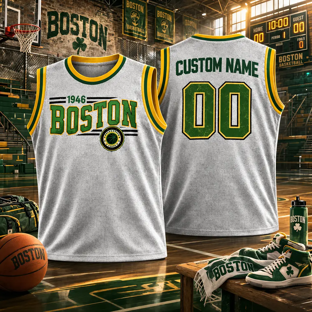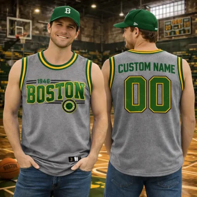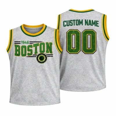 Create your own Boston Celtics NBA basketball jersey in gray with custom name and number on the back. Featuring bold Boston graphics, green and gold trim, and a classic sleeveless design, this jersey is perfect for game day, casual wear, team events, or gifting.