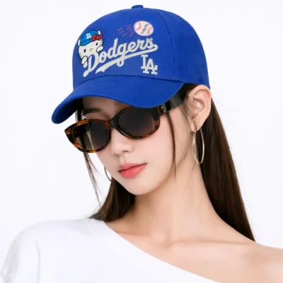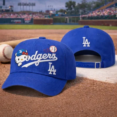 Cute Hello Kitty Dodgers MLB Baseball Dad Hat features a bright royal blue design with playful Hello Kitty artwork, bold Dodgers script embroidery, and classic LA logo details for a fun sporty look. Finished with a curved brim and adjustable back strap, this adorable cap is perfect for casual wear, game day outfits, outdoor adventures, or as a sweet gift for Dodgers and Hello Kitty fans.