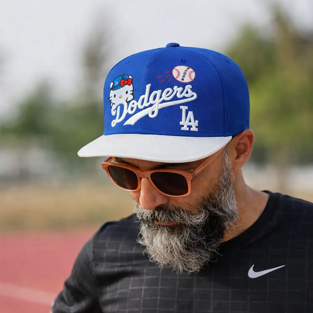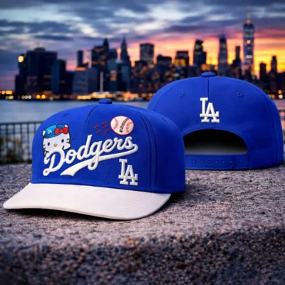 Featuring a vibrant royal blue and white colorway, this playful snapback cap stands out with Hello Kitty artwork, bold Dodgers script embroidery, and classic LA logo details for a fun sporty finish. The flat brim and adjustable snapback closure provide a comfortable fit, making it a cute choice for casual wear, game day outfits, outdoor activities, or as a sweet gift for Dodgers and Hello Kitty fans.