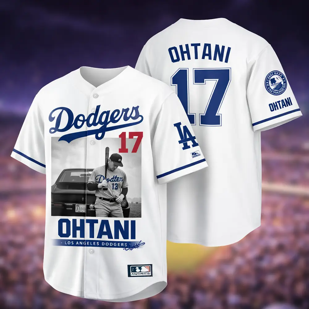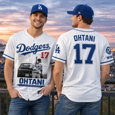 Show your baseball style with this Dodgers Ohtani 17 jersey in white. The front features classic Dodgers script, number 17, and a photo-style graphic design that gives the jersey a bold and modern look. The back includes Ohtani name and number 17, while the sleeve adds the LA logo for an extra sporty touch. Easy to wear with jeans, shorts, or sneakers, this jersey is a great choice for casual wear, game day, or as a gift for Dodgers fans.