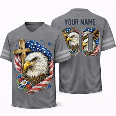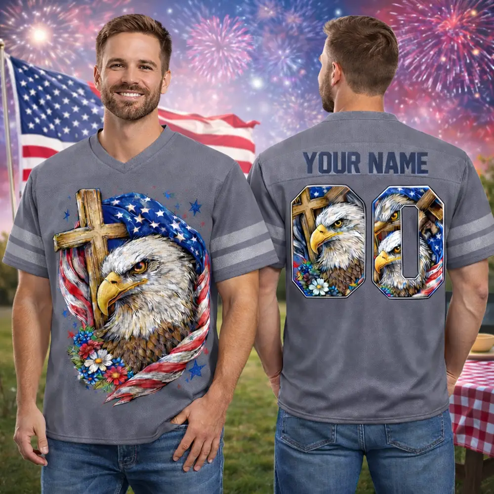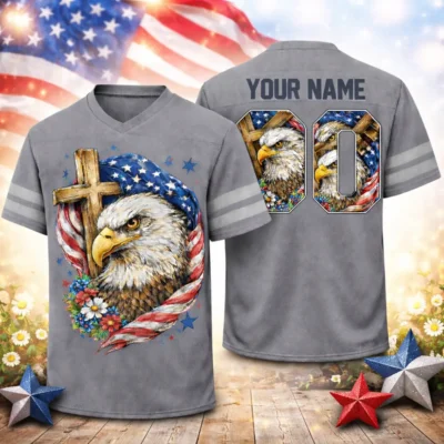 A striking blend of Christian faith and American spirit gives this Eagle Cross 4th of July Football Jersey Patriotic Christian Faith its standout appeal. The football jersey style adds sporty energy, while the eagle and cross design brings deeper meaning to the overall look. Ideal for Independence Day events, patriotic worship gatherings, and seasonal wear, this jersey offers a memorable way to honor both God and country.