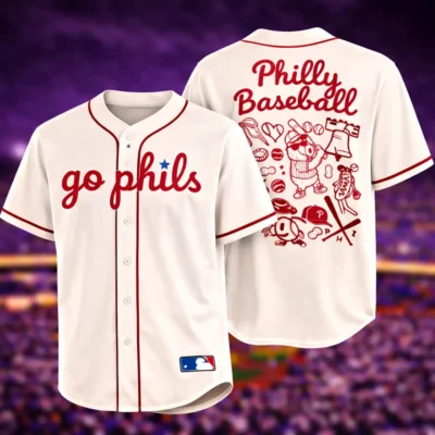 Add a fun and playful baseball style to your wardrobe with this Go Phils jersey in vintage cream. The front features simple go phils text for a clean and sporty everyday look. The back stands out with Philly Baseball text, cartoon mascot graphics, and baseball-themed icons that give the jersey a lively and eye-catching design. Easy to pair with jeans, shorts, or sneakers, this jersey is a great choice for casual wear, game day, or as a gift for Philadelphia baseball fans.