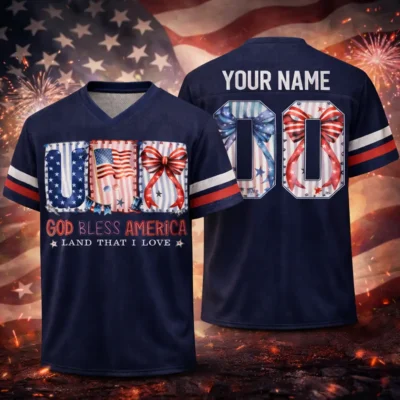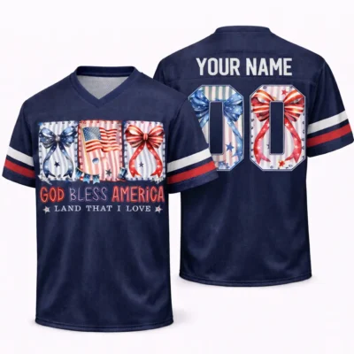 Patriotic spirit stands out beautifully in this God Bless America Patriotic Football Jersey Fourth of July American Flag Design. Made for those who love bold American style, this football jersey features a strong red, white, and blue look that fits perfectly with Independence Day celebrations, summer events, and game day outfits. It is a great choice for showing pride in faith, freedom, and country with a sporty and eye-catching design.