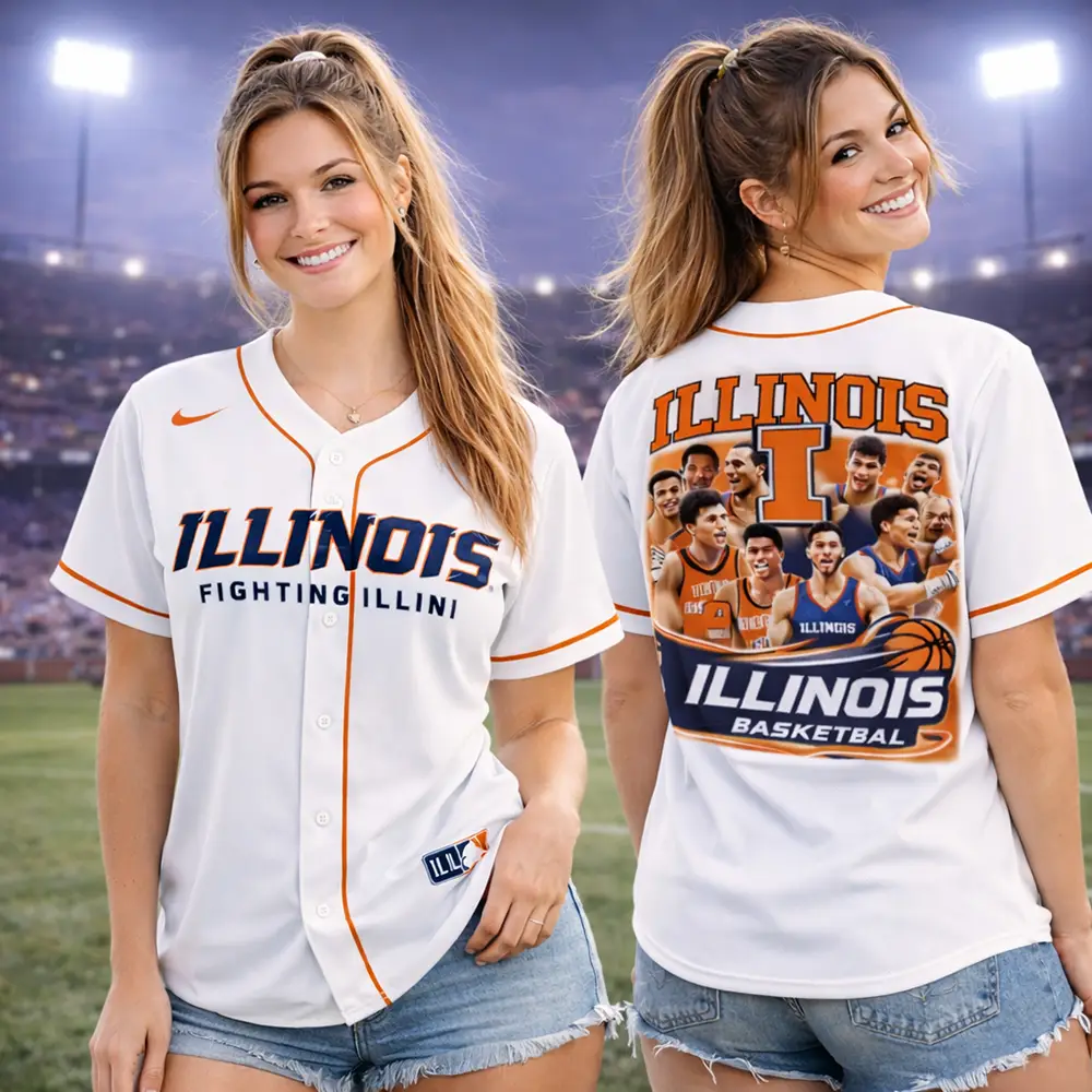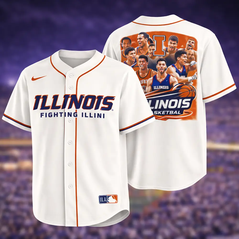 Support your team in style with this Illinois Fighting Illini jersey in white. The front features bold Illinois Fighting Illini text in classic orange and blue for a clean and sporty look. The back stands out with a large team player graphic, Illinois Basketball artwork, and bold school branding that give the jersey a more energetic and eye-catching design. Easy to wear with jeans, shorts, or sneakers, this jersey is a great choice for game day, casual outfits, or as a gift for Illinois basketball fans