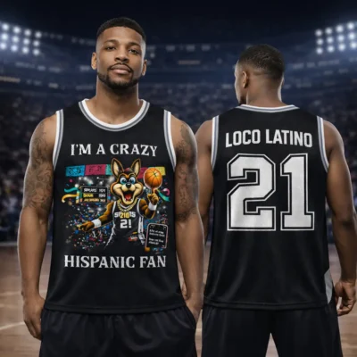 Show off your team spirit with this I’m a Crazy Spurs Fan Coyote 210 basketball jersey in a bold black colorway. The front features a fun coyote-inspired fan graphic with playful game day artwork, while the back stands out with Loco Latino and number 21 for an extra sporty touch. The black base with gray trim gives it a clean athletic look that is easy to wear for basketball games, casual outfits, fan events, or as a fun gift for Spurs supporters.