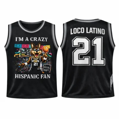 Show off your team spirit with this I’m a Crazy Spurs Fan Coyote 210 basketball jersey in a bold black colorway. The front features a fun coyote-inspired fan graphic with playful game day artwork, while the back stands out with Loco Latino and number 21 for an extra sporty touch. The black base with gray trim gives it a clean athletic look that is easy to wear for basketball games, casual outfits, fan events, or as a fun gift for Spurs supporters.