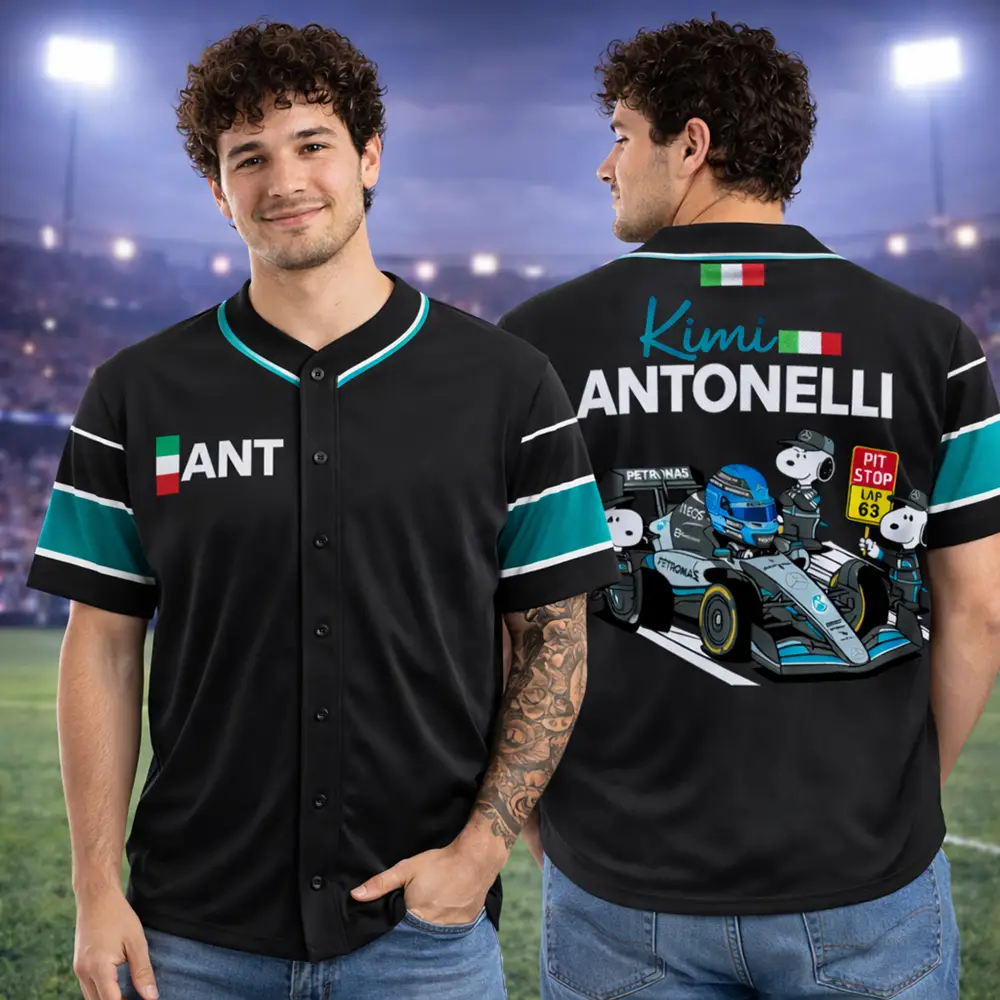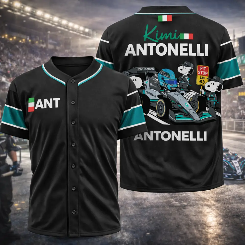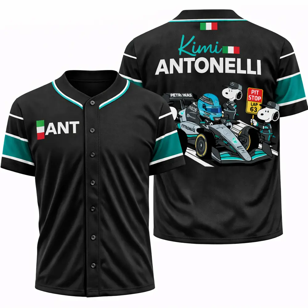 Add playful motorsport style to your wardrobe with this Kimi Antonelli black baseball jersey. The front keeps it simple with a clean ANT graphic and Italian flag detail, while the back stands out with Kimi Antonelli text and a fun cartoon-inspired racing design featuring a Formula-style car and pit stop artwork. The black base with teal and white accents gives it a sporty modern look that pairs easily with jeans, shorts, or sneakers. A great choice for racing fans, casual wear, or as a gift for Kimi Antonelli supporters.
