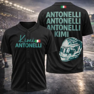 Bring sleek racing style to your wardrobe with this Kimi Antonelli baseball jersey in classic black. The front features a clean Kimi Antonelli text design with an Italian flag accent, while the back stands out with repeated Antonelli lettering and a bold racing helmet graphic. The black base paired with teal details creates a sharp sporty look that is easy to style with jeans, shorts, or sneakers. A great choice for Formula 1 fans, casual wear, or as a gift for Kimi Antonelli supporters.