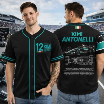 Show your passion for motorsport with this Kimi Antonelli baseball jersey featuring a bold number 12 front graphic and a standout back design with Antonelli text, race car artwork, and blueprint-inspired details. The black and teal color combination gives it a modern athletic look that works well for race day, casual outings, or everyday fan wear.