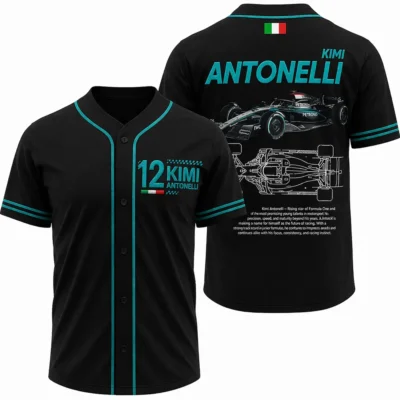 Show your passion for motorsport with this Kimi Antonelli baseball jersey featuring a bold number 12 front graphic and a standout back design with Antonelli text, race car artwork, and blueprint-inspired details. The black and teal color combination gives it a modern athletic look that works well for race day, casual outings, or everyday fan wear.