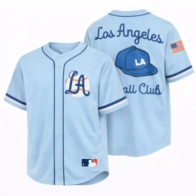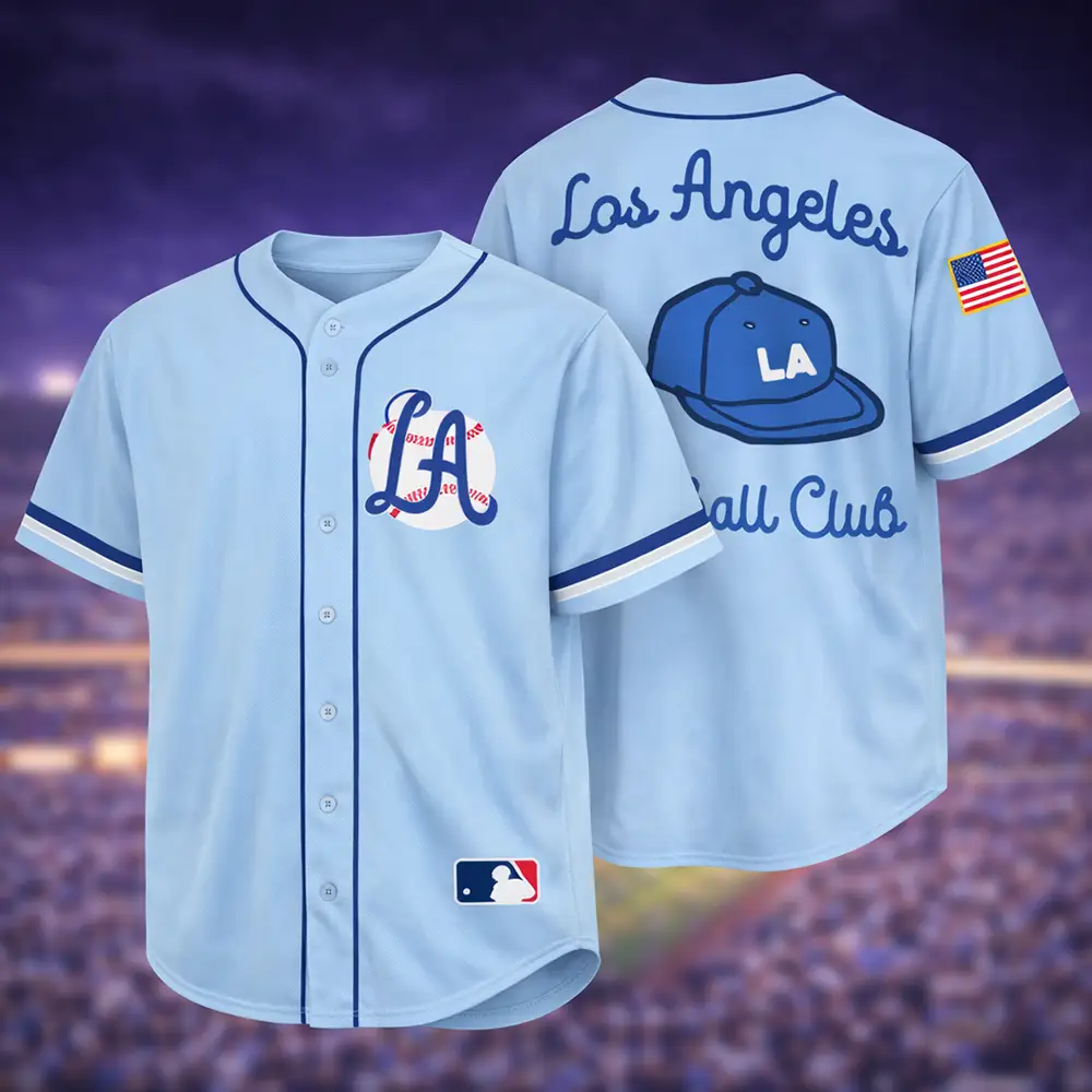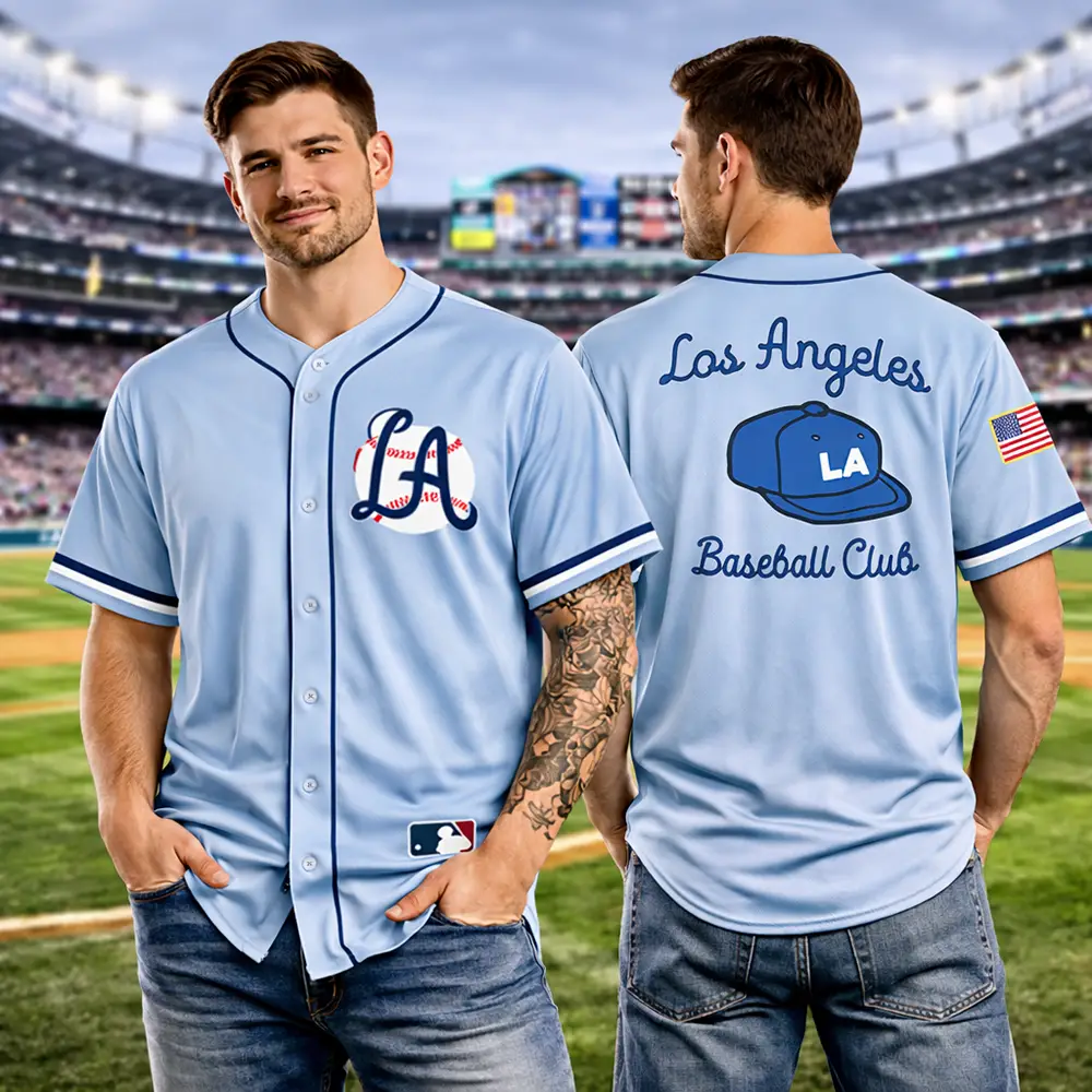 Keep your look fresh and simple with this Los Angeles Baseball Club jersey in light blue. The front features a clean LA baseball graphic, while the back is designed with Los Angeles script, an LA cap illustration, and Baseball Club text for a fun and sporty style. The soft light blue color gives it a relaxed and eye-catching look that is easy to wear with jeans, shorts, or sneakers. A great choice for casual wear, game day, or as a gift for baseball fans.
