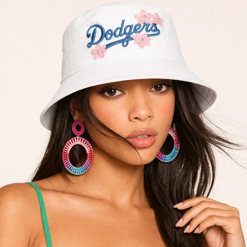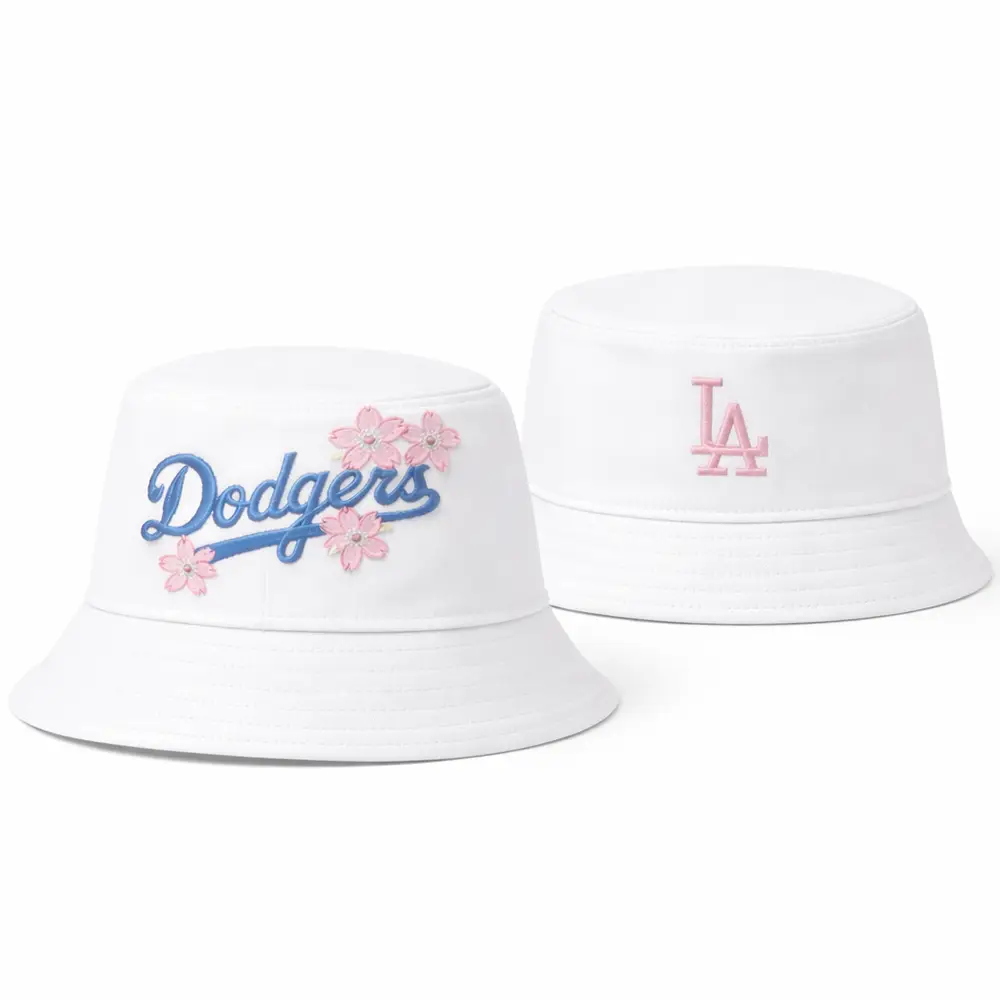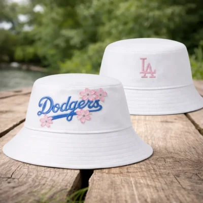 This bucket hat blends classic Dodgers style with a playful floral touch, featuring blue script embroidery, pink blossom accents, and a clean white finish that feels fresh and modern. Comfortable and easy to pair, it is ideal for daily wear, sunny outings, and effortless casual fashion.