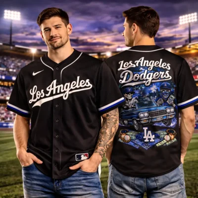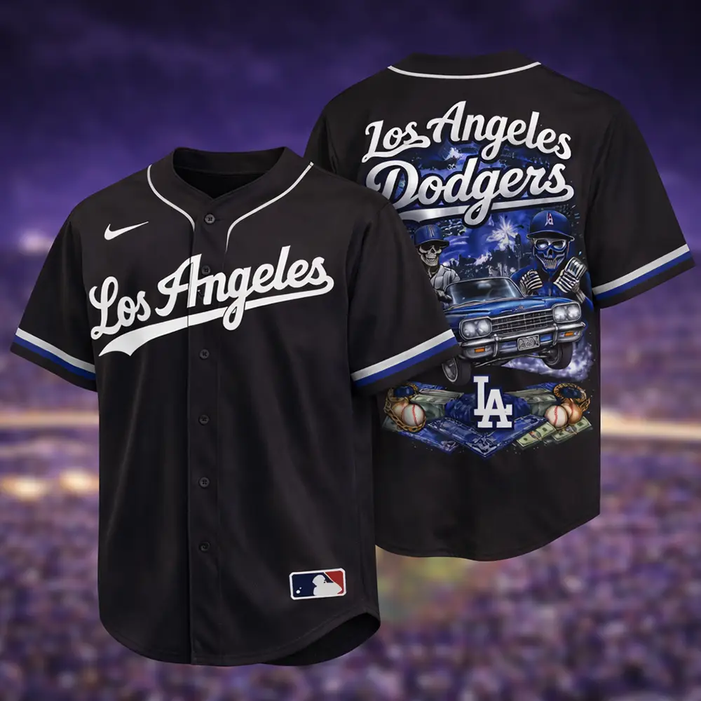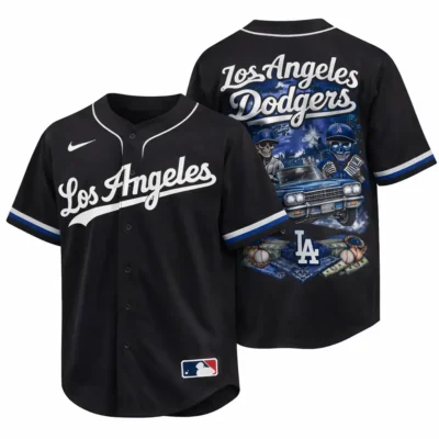 Give your outfit a bold baseball look with this Los Angeles Dodgers jersey in black. The front keeps it clean with classic Los Angeles script, while the back stands out with a detailed graphic design featuring skull characters, a classic car, baseball elements, cash details, and the LA logo. The black color adds a strong and stylish touch that is easy to match with jeans, shorts, or sneakers. A great choice for casual wear, game day, or for anyone who likes baseball fashion with a more striking design.