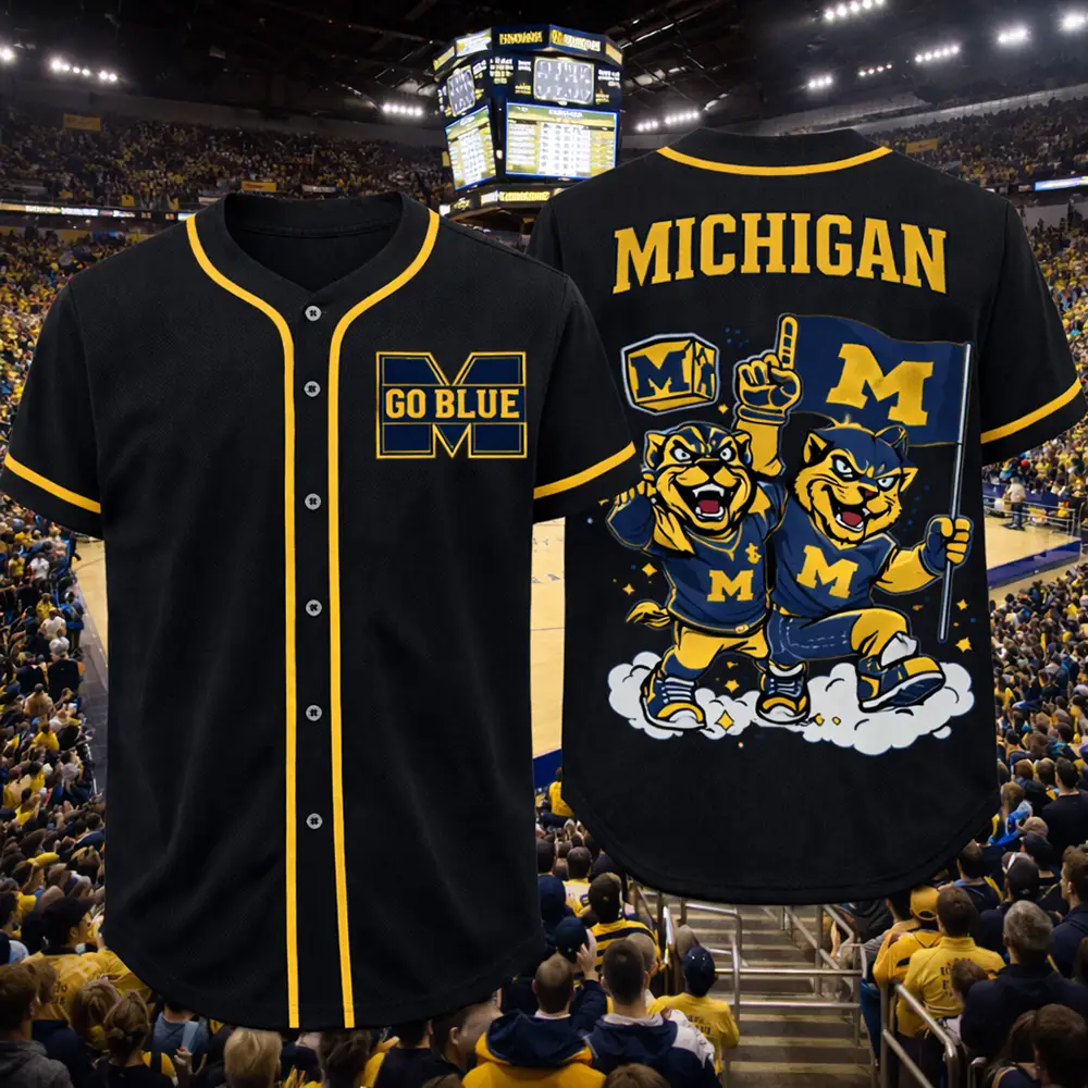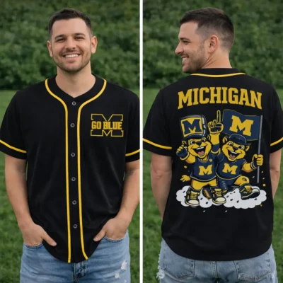 Show off your team pride with this Michigan Go Blue black baseball jersey featuring eye-catching yellow trim and bold front-and-back graphics. The front keeps it simple with a chest logo, while the back stands out with large Michigan text and energetic mascot artwork. Designed for a sporty and stylish look, this jersey is easy to pair with everyday outfits and is perfect for game day, casual outings, or gifting to Michigan supporters.