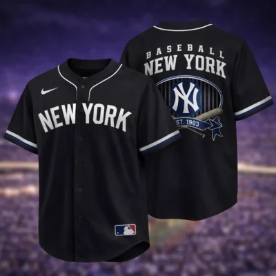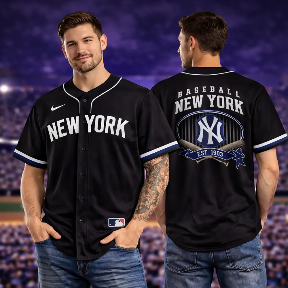 Show off a clean and classic baseball style with this New York jersey in black. The front features bold New York lettering, while the back includes baseball-themed artwork, the NY logo, a bat detail, and Est. 1903 design. The black color gives it a strong and timeless look that is easy to match with jeans, shorts, or sneakers. Great for everyday wear, game day, or as a gift for baseball fans.