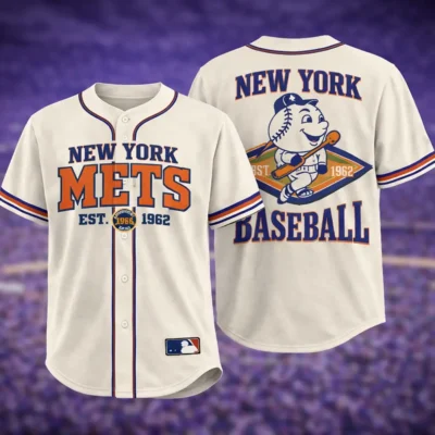 Add a fun and classic baseball look to your wardrobe with this New York Mets jersey in vintage cream. The front features bold New York Mets lettering with Est. 1962 details for a clean team-inspired style. The back stands out with a playful baseball mascot graphic, field-shaped design, and Baseball text that give the jersey a more unique and eye-catching look. Easy to pair with jeans, shorts, or sneakers, this jersey is a great choice for casual wear, game day, or as a gift for Mets fans.