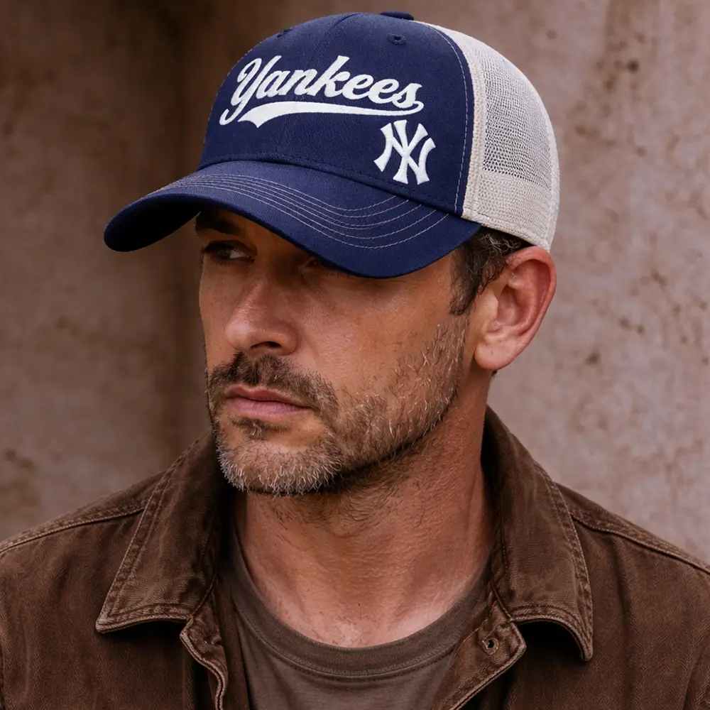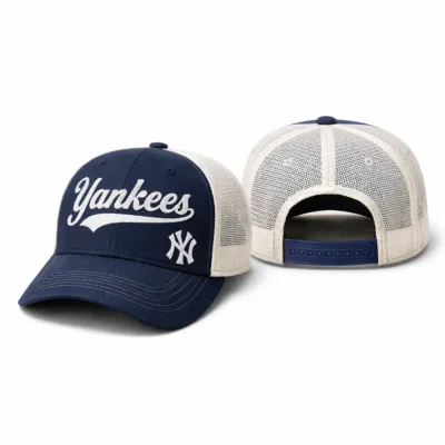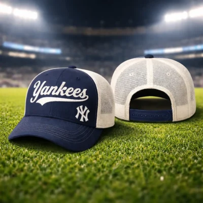 Show your team spirit in classic style with this New York Yankees mesh trucker hat. Designed with a bold embroidered Yankees script on the front, this cap features a structured navy crown, breathable white mesh back panels, and an adjustable snapback closure for a secure and comfortable fit. It is a great choice for everyday wear, game day outfits, outdoor activities, and casual streetwear styling.