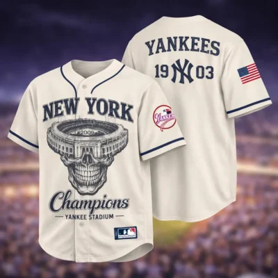 Make your outfit stand out with this Yankee Baseball Stadium Cool jersey. Featuring bold New York text, a striking stadium and skull graphic, and championship-inspired details, this design brings a strong and edgy baseball style. The back is finished with Yankees lettering, the NY logo, and 1903 graphics for a classic team look. Easy to pair with jeans, shorts, or sneakers, this jersey is a great pick for casual wear, game day, or for anyone who loves bold baseball-inspired fashion.