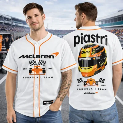 Fresh, clean, and race-inspired, this Oscar Piastri McLaren baseball jersey brings a standout motorsport look in a crisp white and orange colorway. The front features McLaren Formula 1 Team graphics with checkered flags and a race car design, while the back highlights a bold Piastri print with a large helmet graphic for extra fan appeal. The bright white base with orange trim gives this jersey a sharp, modern style that looks great with jeans, shorts, or sneakers. A perfect choice for race day outfits, casual streetwear, or gifting to McLaren and Oscar Piastri fans.