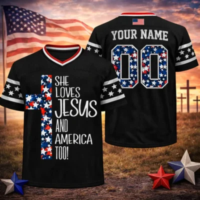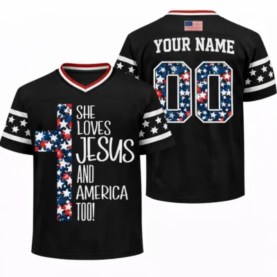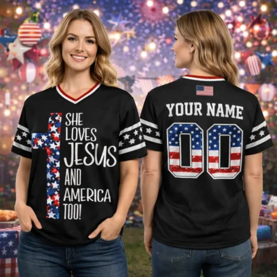 Faith and patriotism meet in a bold, wearable look with this Patriotic Christian Loves Jesus and America Football Jersey. Designed for those who want to celebrate both belief and country, this jersey blends a sporty football style with a strong Christian patriotic message. It is a meaningful choice for Fourth of July events, church gatherings, family celebrations, and summer holiday wear.