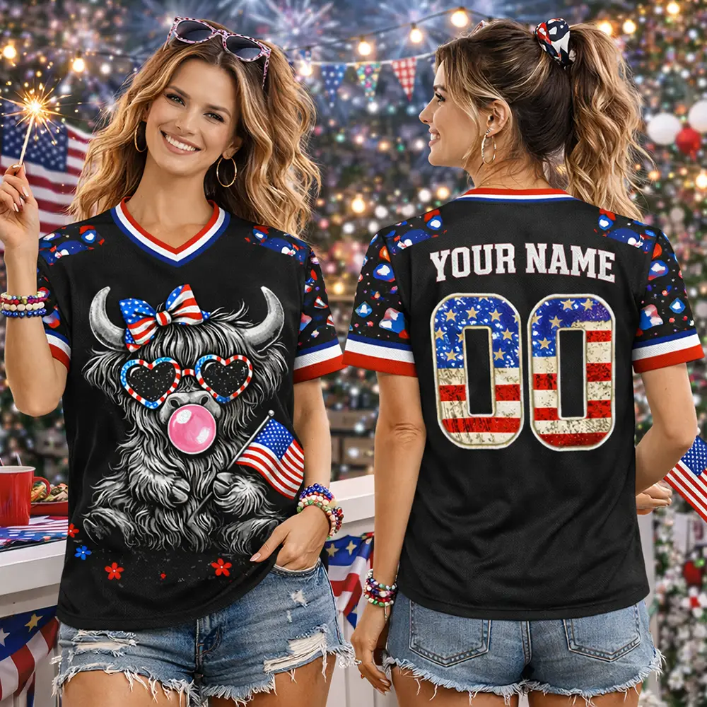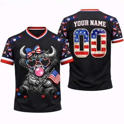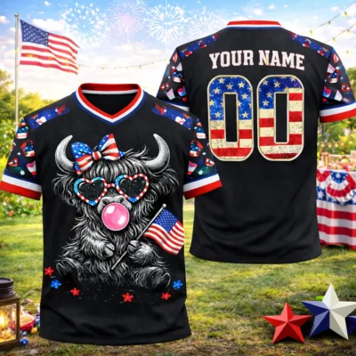 A festive bow detail adds extra charm to this Patriotic Highland Cow Football Jersey Independence Day Bow Theme. The playful highland cow design brings a fun country-inspired touch, while the football jersey style keeps the look bold, sporty, and perfect for holiday celebrations. It is a great option for Fourth of July parties, summer outings, and anyone who loves cute patriotic fashion with personality.