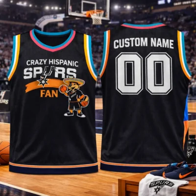 Bring fun energy to your fan wardrobe with this Crazy Hispanic Spurs Fan basketball jersey featuring custom name and number on the back. The front design stands out with bold team-inspired text and playful basketball artwork, while the black base and colorful trim give it a sporty look that works great for game day, casual wear, or gifting.
