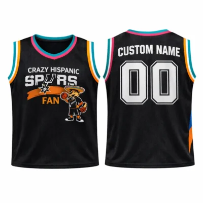 Bring fun energy to your fan wardrobe with this Crazy Hispanic Spurs Fan basketball jersey featuring custom name and number on the back. The front design stands out with bold team-inspired text and playful basketball artwork, while the black base and colorful trim give it a sporty look that works great for game day, casual wear, or gifting.