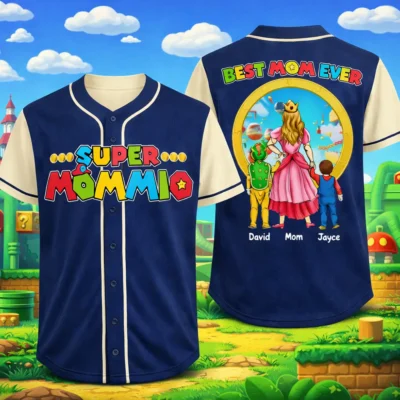 Family love takes center stage in this Personalized Super Mommio Baseball Jersey Custom Kids Names, designed to celebrate motherhood in a fun and creative way. Adding children’s names makes the design more meaningful, turning this jersey into a keepsake that feels personal and special. Perfect for casual wear, family photos, and gift giving, it brings together comfort, style, and mom pride.