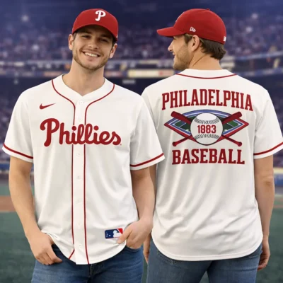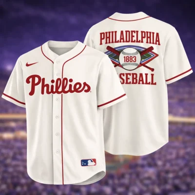 Keep your baseball look clean and classic with this Philadelphia Phillies jersey in vintage cream. The front features bold Phillies script in a simple team-inspired design. The back stands out with Philadelphia Baseball text, an 1883 baseball graphic, crossed bats, and a field-style background that add a strong vintage baseball feel. Easy to pair with jeans, shorts, or sneakers, this jersey is a great choice for everyday wear, game day, or as a gift for Phillies fans.