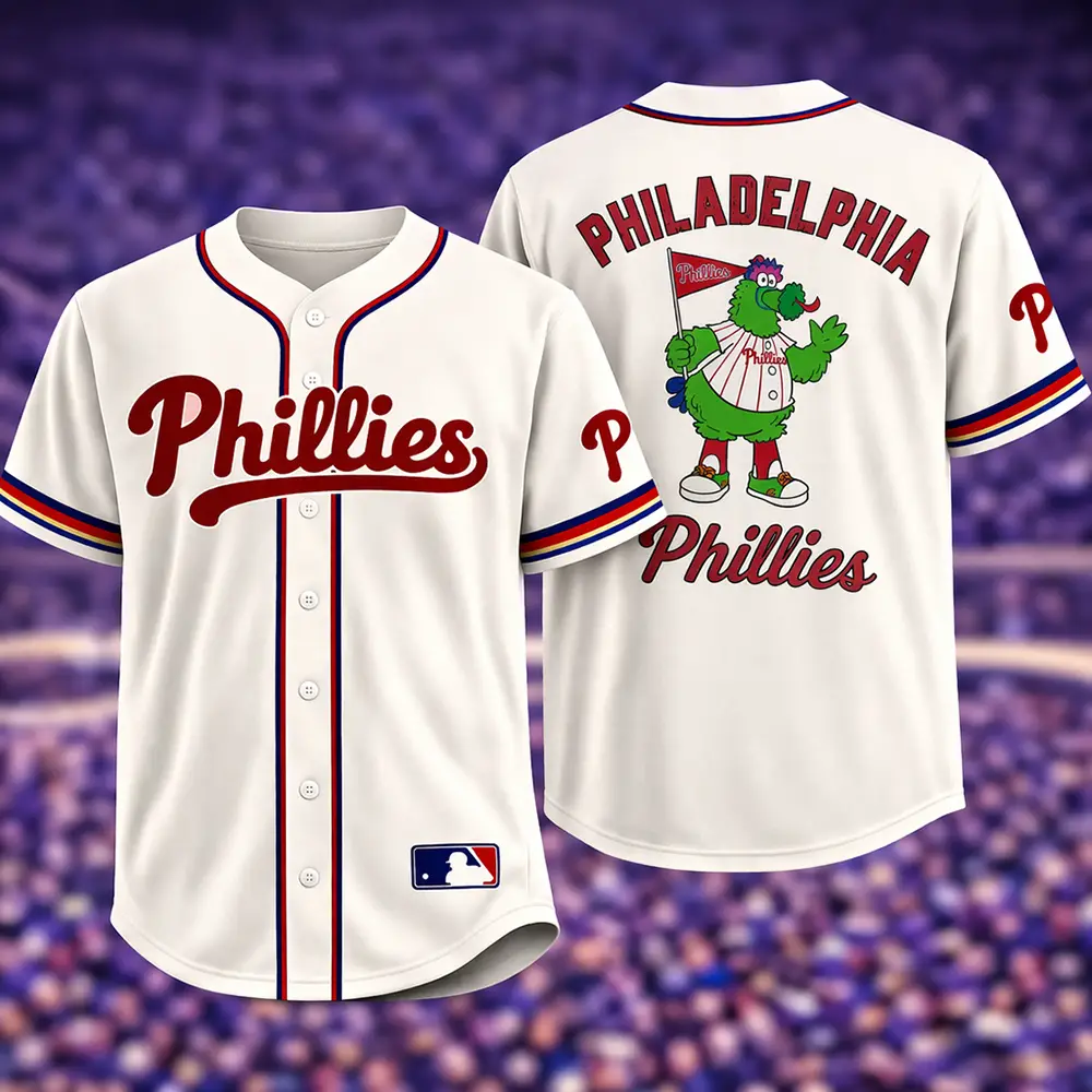 Add a fun and playful touch to your baseball style with this Philadelphia Phillies jersey in vintage cream. The front features bold Phillies script in classic team colors for a clean and sporty look. The back stands out with a Philadelphia Phillies mascot graphic holding a team flag, giving the jersey a unique and eye-catching design. Easy to pair with jeans, shorts, or sneakers, this jersey is a great choice for casual wear, game day, or as a gift for Phillies fans.