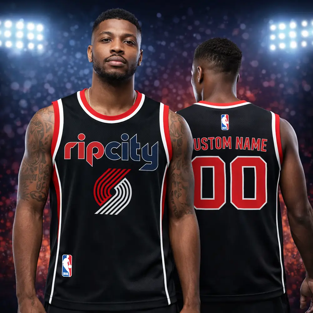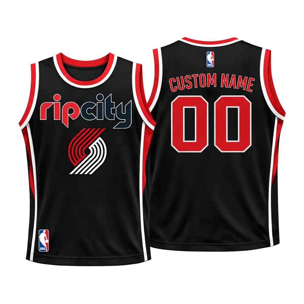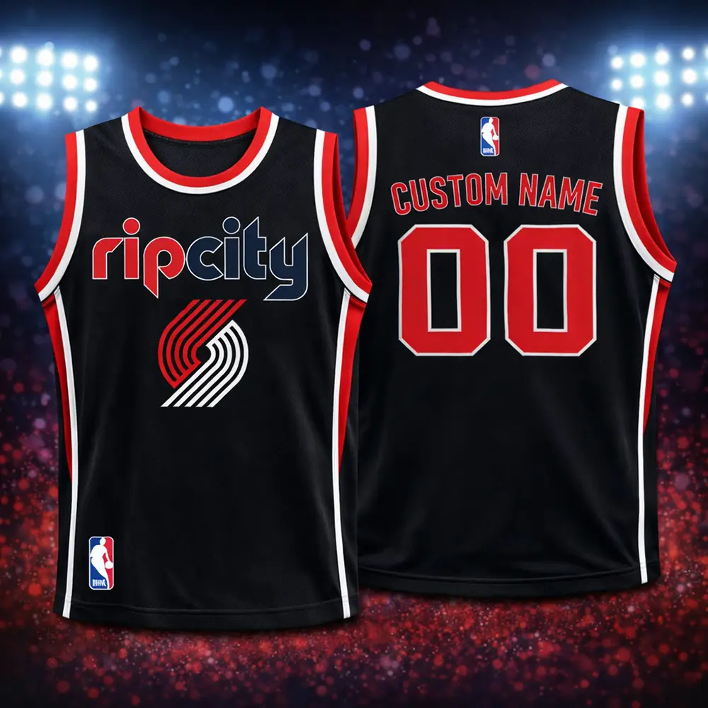 The Portland Trail Blazers Rip City black basketball jersey is a stylish pick for fans who want a bold and sporty look. Designed with a sleek black base, red and white trim, and eye-catching Rip City graphics, this jersey brings strong team spirit and everyday comfort together. The lightweight, breathable fabric helps keep you cool, while the athletic fit makes it ideal for game day, casual wear, training, or gifting. It is a great choice for Portland Trail Blazers supporters who want standout fan apparel with a modern basketball style.