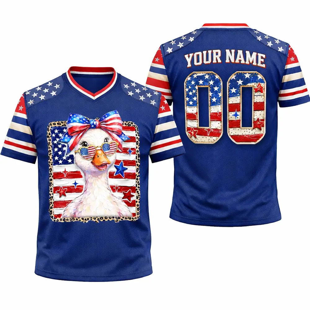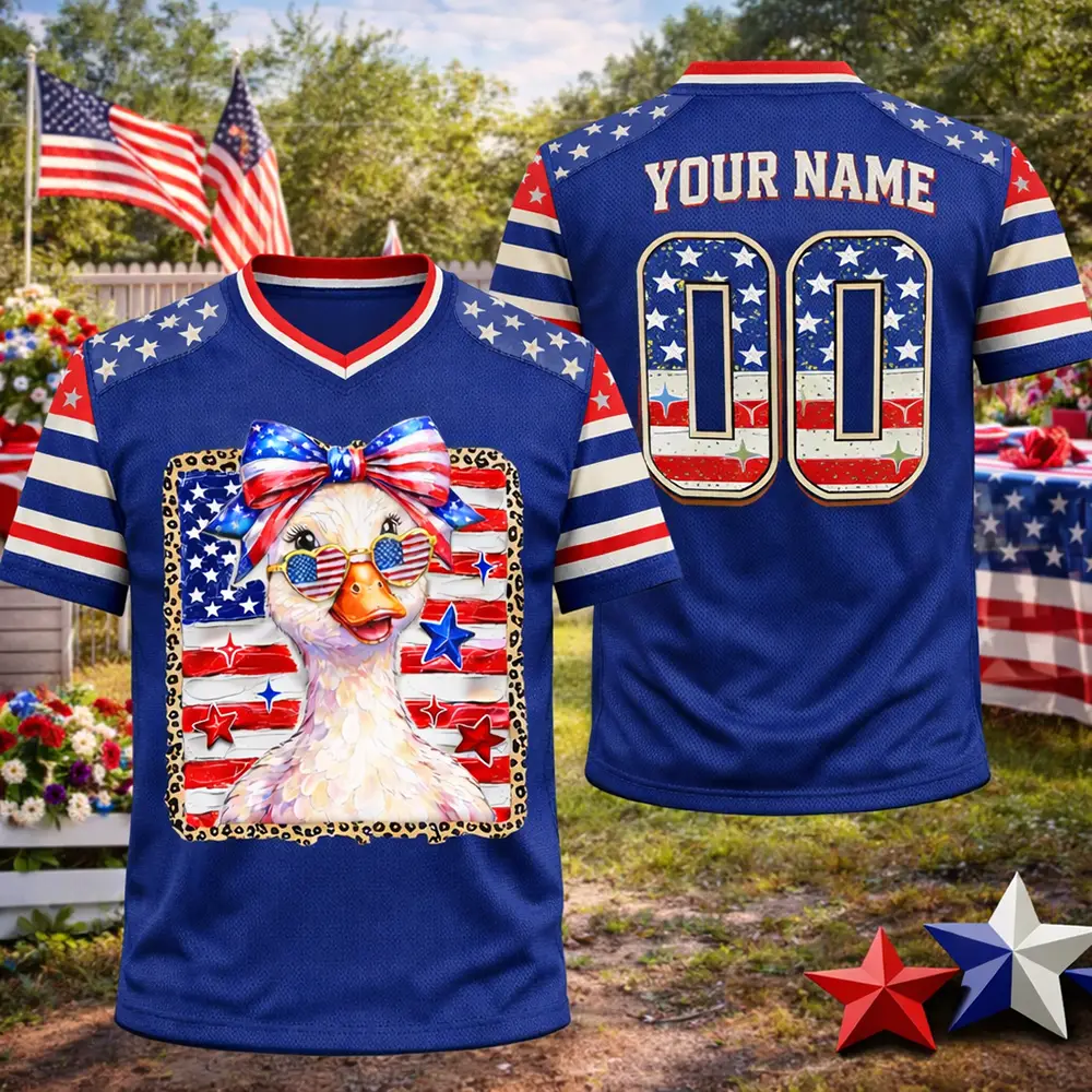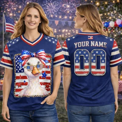 A trendy holiday outfit starts with this Preppy Goose Football Jersey Coquette Patriotic 4th of July Design. The design blends sweet feminine energy with classic patriotic flair, creating a fun look for summer celebrations, family events, and seasonal photos. The football jersey style keeps it bold and eye-catching, while the goose theme adds a lighthearted and fashionable twist.