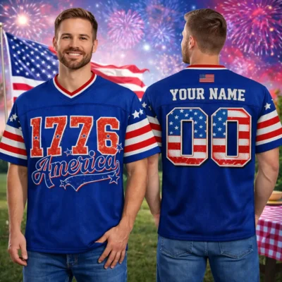 Vintage-inspired details give this Retro 1776 America Football Jersey Vintage Flag Style a timeless patriotic look for the season. The classic football jersey design pairs perfectly with the old-school America theme, making it a great choice for Fourth of July celebrations, summer events, and everyday patriotic wear. It is a stylish option for anyone who loves bold USA fashion with a retro touch.