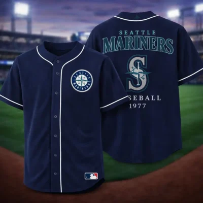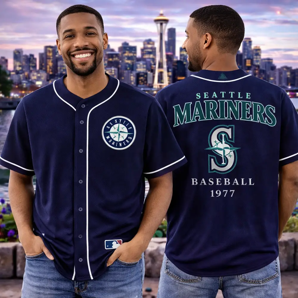 Show a clean and classic baseball look with this Seattle Mariners jersey in navy blue. The front features a Mariners compass logo for a simple team-inspired style. The back adds Seattle Mariners text, a large S logo, and 1977 details that give the jersey a bold and timeless finish. Easy to pair with jeans, shorts, or sneakers, this jersey is a great choice for casual wear, game day, or as a gift for Mariners fans.