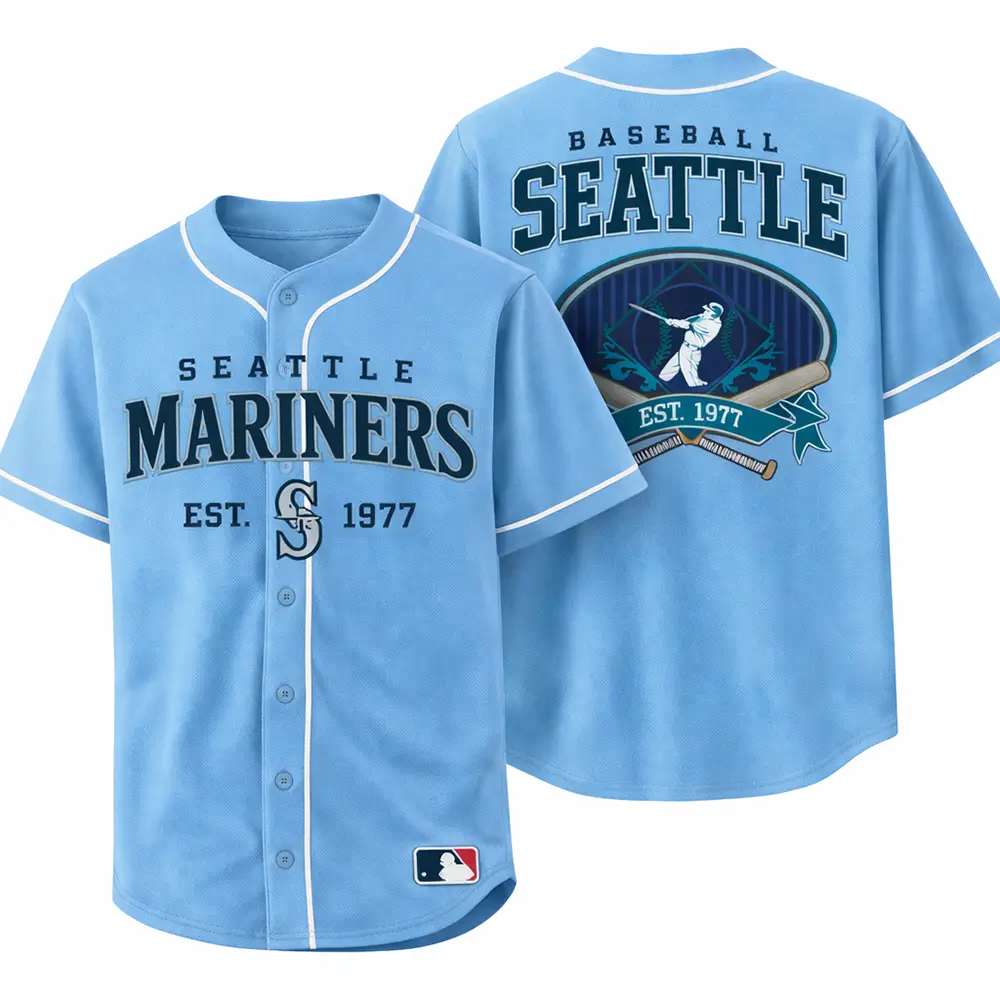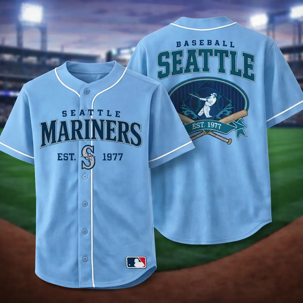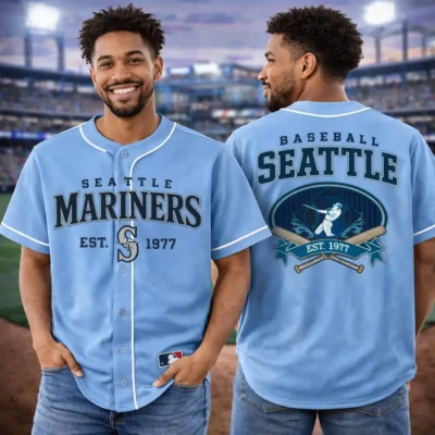 Add a fresh baseball look to your wardrobe with this Seattle Mariners jersey in light blue. The front features Seattle Mariners text with Est. 1977 details and a team-inspired logo for a clean sporty style. The back stands out with Baseball Seattle text, a player swing graphic, crossed bats, and Est. 1977 artwork that give the jersey more depth and character. Easy to wear with jeans, shorts, or sneakers, this jersey is a great choice for casual outfits, game day, or as a gift for Seattle baseball fans.