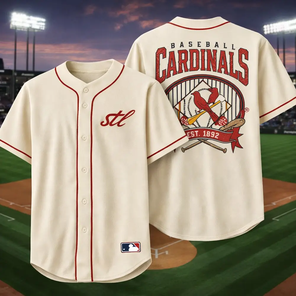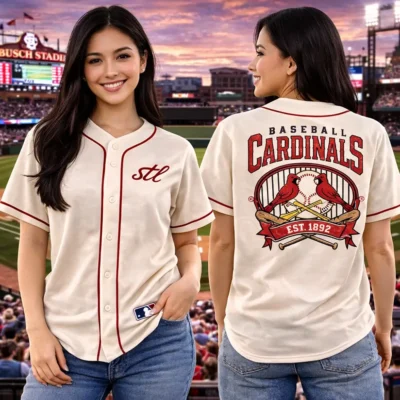 This St. Louis Cardinals jersey brings a classic baseball feel with a clean front and a detailed back design. The front keeps it simple with the STL script, while the back features Baseball Cardinals text, two cardinal birds on a bat, crossed bats, and Est. 1892 details for a strong vintage-inspired look. The vintage cream color gives it a softer style that is easy to wear with jeans, shorts, or sneakers. It is a great option for casual outings, game day, or for fans who like timeless baseball fashion.