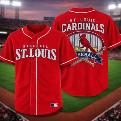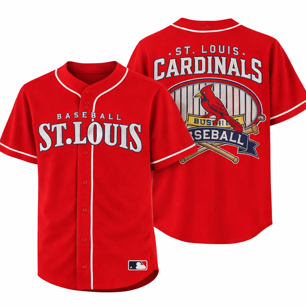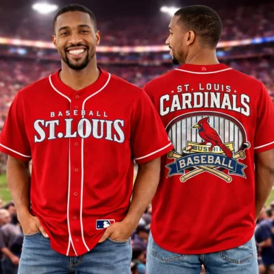Show off a bold baseball look with this St. Louis Cardinals jersey in bright red. The front features Baseball St. Louis lettering for a strong and classic team-inspired style. The back stands out with St. Louis Cardinals text, a cardinal bird graphic, crossed bats, and baseball-themed artwork that add more detail to the design. Easy to wear with jeans, shorts, or sneakers, this jersey is a great choice for casual wear, game day, or as a gift for Cardinals fans.