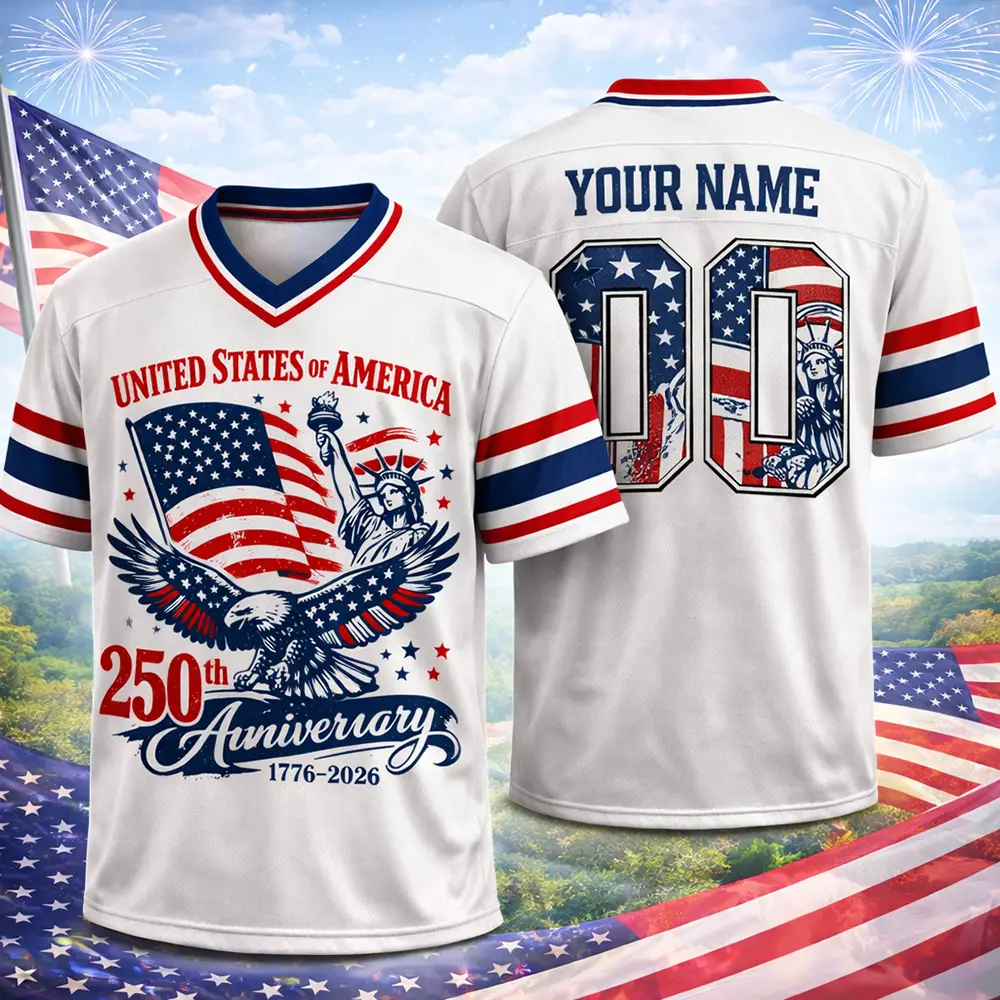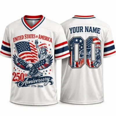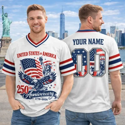 Celebrate American heritage with the USA 250 Years Anniversary 1776–2026 Football Jersey. Created to honor 250 years of the United States, this patriotic football jersey combines bold style with a strong sense of national pride. Perfect for 4th of July parties, parades, tailgates, BBQs, and summer celebrations, it is a standout choice for anyone who wants to show off their USA spirit in a sporty way.