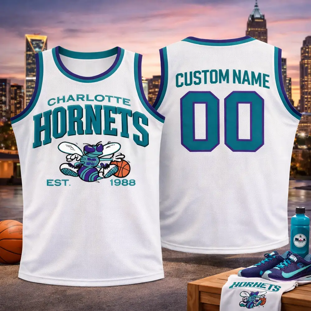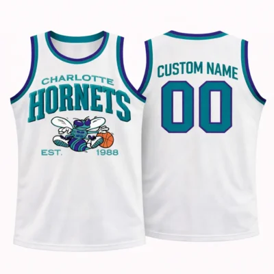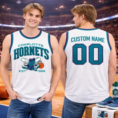 Bring classic Charlotte basketball style to your wardrobe with this custom Charlotte Hornets jersey in a clean white colorway. The front stands out with bold Hornets lettering, a vintage-inspired mascot graphic, and 1988 detail that adds a nostalgic team feel. The back can be personalized with your chosen name and number, making it a unique piece for fans who want something more personal. Finished with teal and purple trim, this sleeveless jersey is a great pick for game day, casual streetwear, basketball events, or a thoughtful gift.